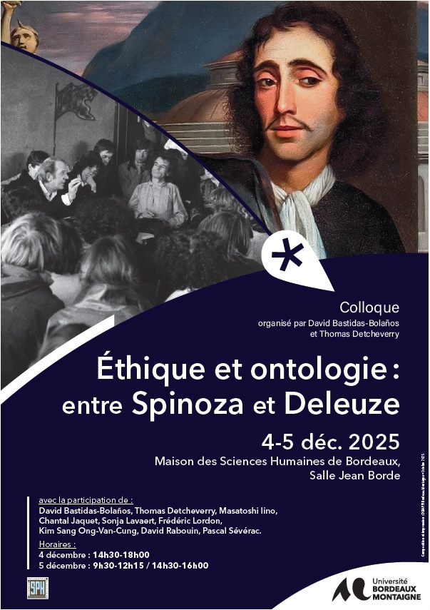 4-5 décembre 2025, MSH Bordeaux, salle Jean BordeColloque "Ethique et ontologie : entre Spinoza et Deleuze", organisé par David Bastidas-Bolaños (SPH) et Thomas Detcheverry (SPH).Télécharger le document lié