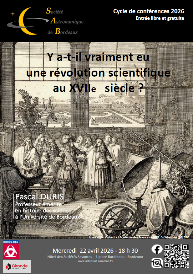 Mercredi 22 avril 2026, 18h30-20h, Hôtel des Sociétés savantesConférence de Pascal Duris (SPH) intitulée "Y a-t-il vraiment eu une révolution scientifique au XVIIe siècle ?" devant la Société astronomique de Bordeaux.