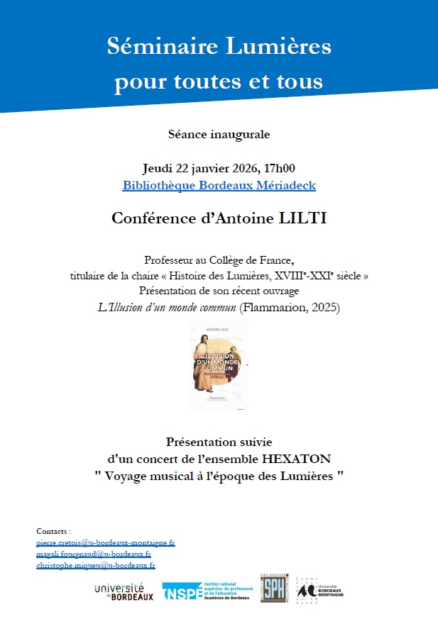 Jeudi 22 janvier 2026, Bibliothèque Bordeaux-Mériadeck, 17hConférence d'Antoine Lilti, professeur au Collège de France, autour de son dernier ouvrage L'illusion d'un monde commun. Tahiti et la découverte de l'Europe (Flammarion, 2025), à l'invitation de P. Crétois (SPH), M. Fourgnaud (SPH) et Ch. Miqueu (SPH).