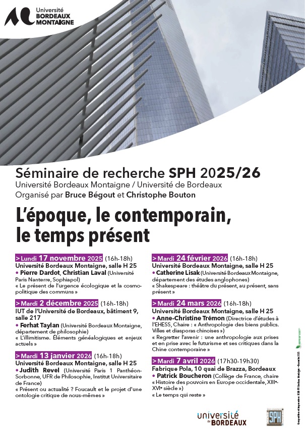 Lundi 17 novembre 2025, Université Bordeaux Montaigne, salle H25, 16h-18hPremière séance du séminaire d'équipe intitulé "L'époque, le contemporain, le temps présent", organisé par Bruce Bégout (SPH) et Christophe Bouton (SPH) :- Pierre Dardot et Christian Laval (Université Paris Nanterre, Sophiapol) : "Le présent de l'urgence écologique et la cosmopolitique des communs".